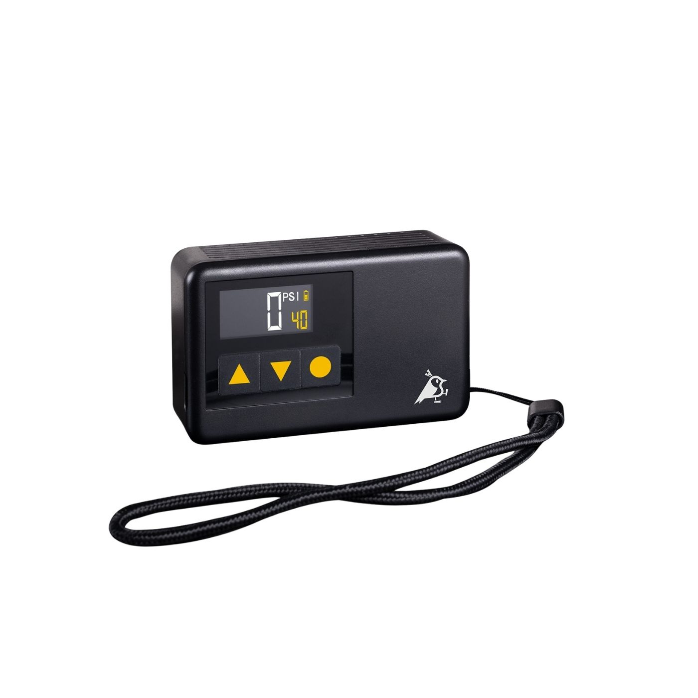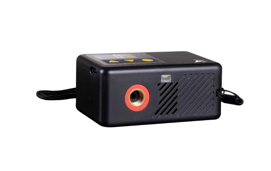 Tillbehör: 1 x bärrem, 1 x slang med Schrader-anslutning, 1 x laddkabel, 1 x bollnål, 1 x Presta-ventil, 1 x Dunlop-ventil