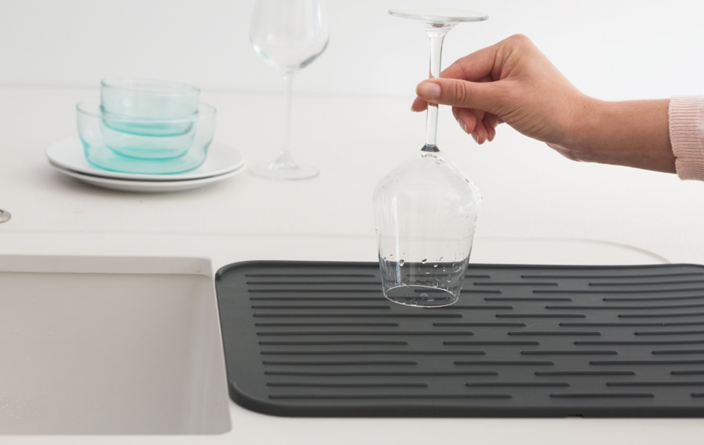 Den mjuka silikonytan är skonsam mot glas och porslin och minskar risken för repor och kantstötar. De upphöjda ribborna gör att luft kan cirkulera under disken, vilket hjälper vattnet att rinna av och påskyndar torkningen. Den upphöjda kanten fångar upp vattnet och förhindrar att det rinner ut på bänkskivan.