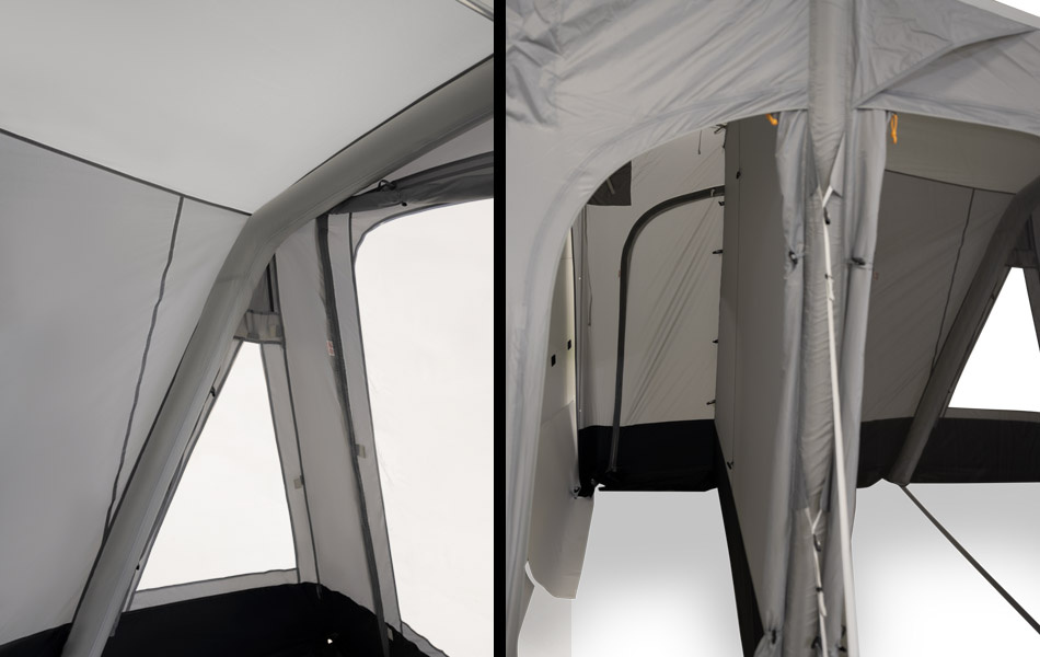 Varje gavel har en smidig dörr som gör det enkelt att ta sig in och ut från båda sidor. Frontpanelen kan rullas upp för ökad ventilation eller användas som en extra ingång när du vill ha mer utrymme. Samtliga fönster och dörrar är utrustade med mörkläggning för extra komfort och avskildhet. Även slussen har egna ingångar för enkelt åtkomst.