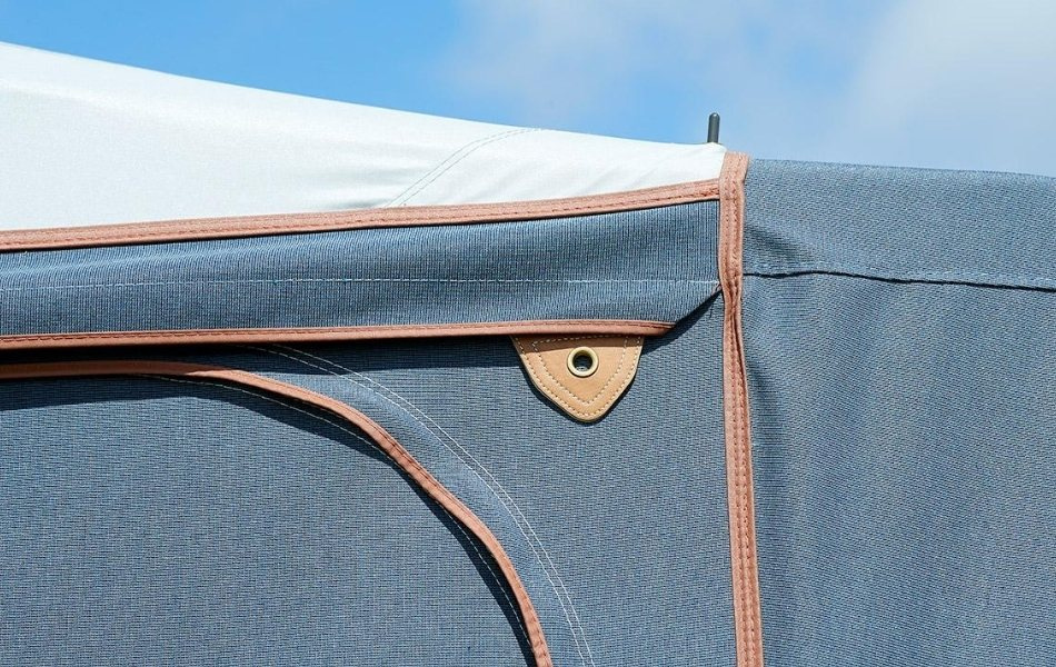 Front- och gavelstyckena kan fällas ned som veranda eller tas bort helt, vilket ger dig flexibilitet oavsett väder. Capri kan väljas med Zinox-stålstativ eller det lättare CarbonX-glasfiberstativet.