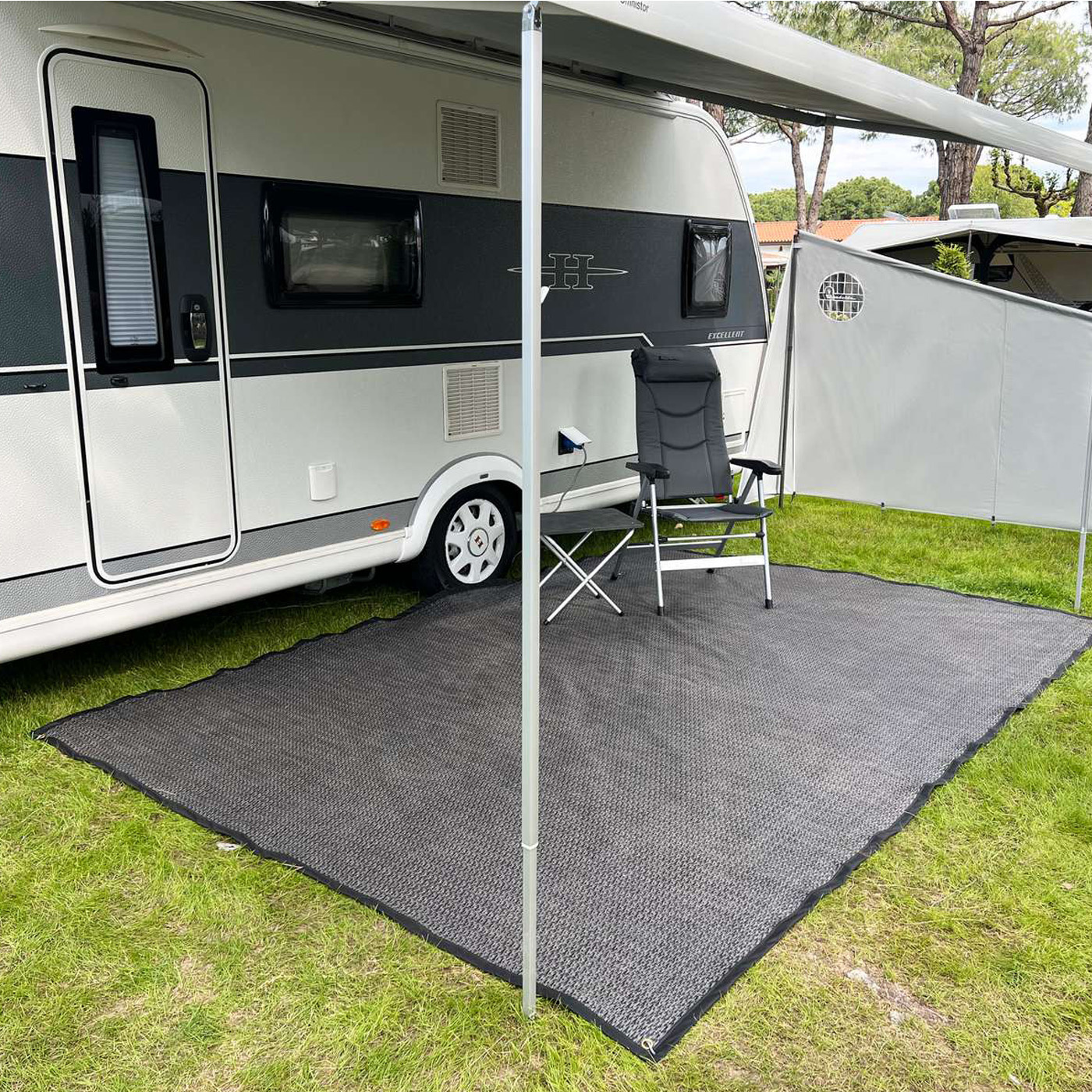 Isabella markismatta har kantsytt band runtom och praktiska pinnhål i varje hörn för en snygg finish och extra hållbarhet. Mattan är vävd av nylontråd (Isabella Carpet), förstärkt med PVC och värmepressad, vilket gör den slitstark och lätt att rengöra. Mattan är konstruerad för att stå emot UV-strålar och är vatten- och brandbeständig. - Egenskaper