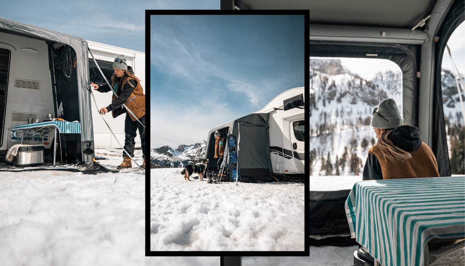 Tänk dig själv att behöva gå in i husvagnen med pjäxor fyllda med snö – med ett Dometic vintertält kan du istället sitta på en stol, skyddad från vind och snö, och ta av dig pjäxorna innan du går in i fordonet.