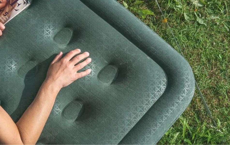 Enkel luftmadrass med mjuk velouroverdel, stabil konstruktion och dubbeltätande ventil. Perfekt för husbil, båt eller camping.