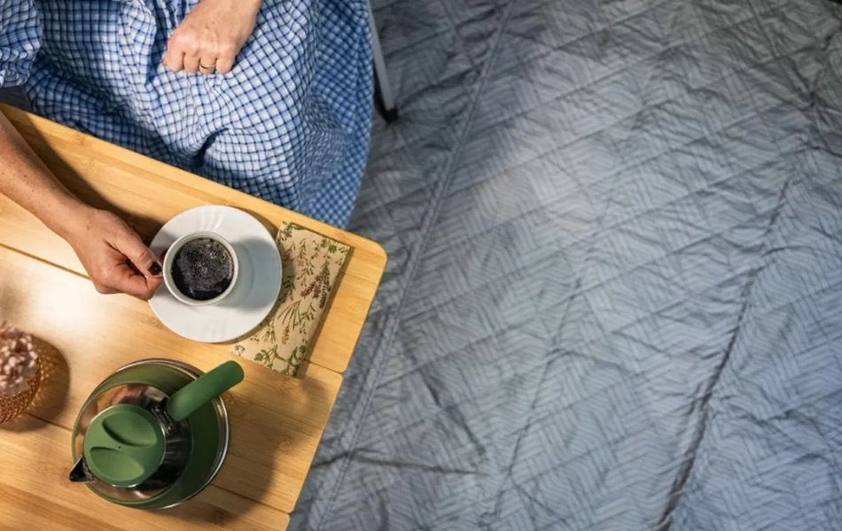 Denna matta skapar en varm och ombonad känsla i tältet. Den mjuka ovansidan känns behaglig under fötterna, och den isolerande fyllningen skyddar mot kall mark och kyliga morgnar.