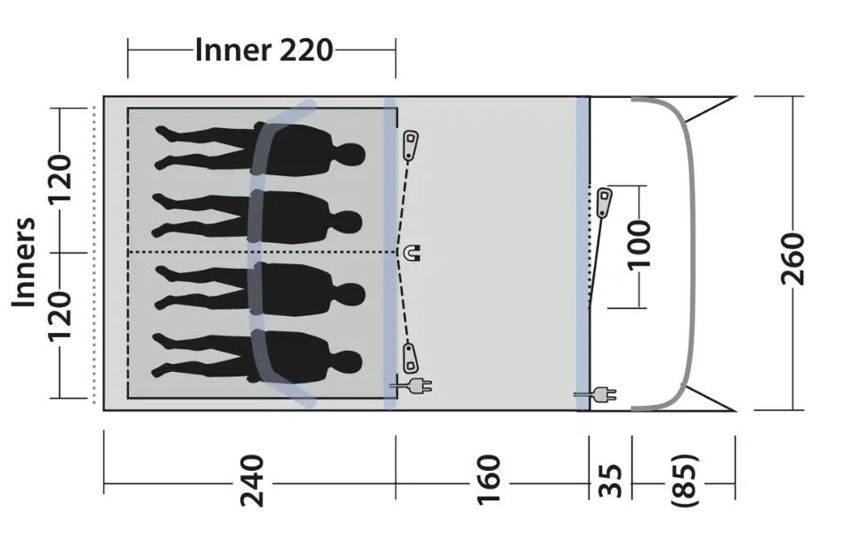 Tältet rymmer upp till fyra personer och är perfekt för mindre familjer eller första campingturen med små barn. Ventilation via toppen av frontfönstren och bak samt skyddad ventilation under den djupa verandan säkerställer optimal luftcirkulation. De flexibla uppvikbara sidorna i verandan ger olika alternativ för skydd mot väder och vind.