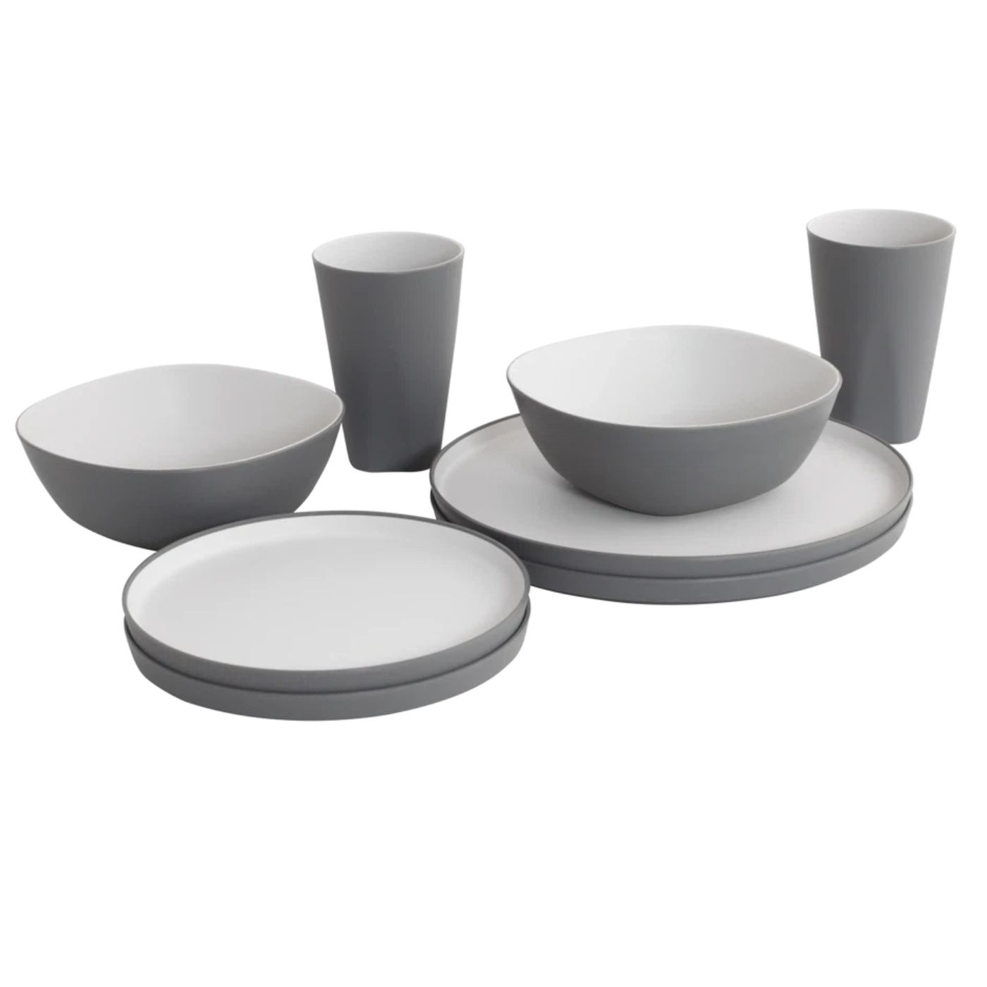 Setet innehåller tallrikar, skålar och muggar och är utvecklat för att klara ett aktivt friluftsliv. Det stöttåliga materialet gör servisen säker att använda även i fordon där stabilitet är viktigt. Muggarna har handtag och kan staplas för smidig och platsbesparande förvaring. Den halkskyddade undersidan minskar både ljud och rörelse under transport.