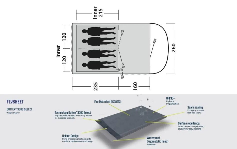 Två mörklagda sovrum rymmer upp till fyra personer och bidrar till bättre sömn, även under ljusa morgnar. Justerbar ventilation ger ett behagligt inomhusklimat, vilket gör tältet till ett utmärkt val för familjer eller par som vill ha extra utrymme under weekendresor och semestrar.