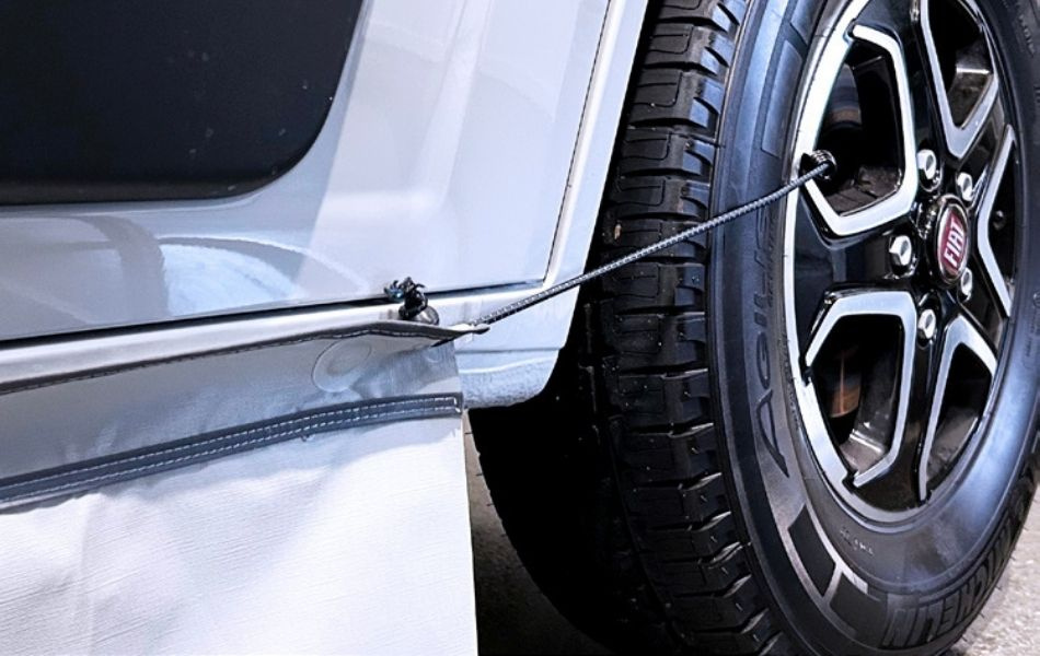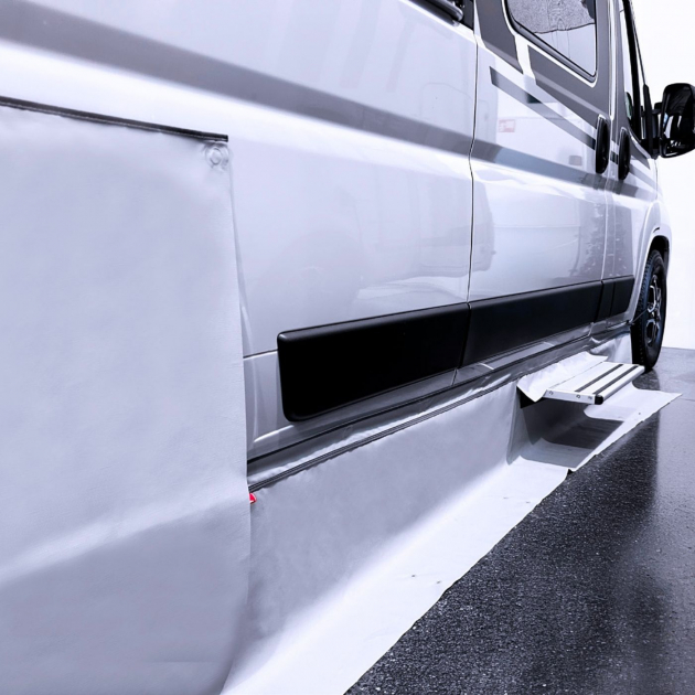 Understycket består av två delar: en lång bit mellan hjulen och en separat del för bakhjulet. Tillverkad i slitstark PVC ger den lång livslängd och skydd mot väder och vind. Magneter och elastiska remmar säkerställer en enkel och skruvfri montering utan att behöva göra hål i campervanen.