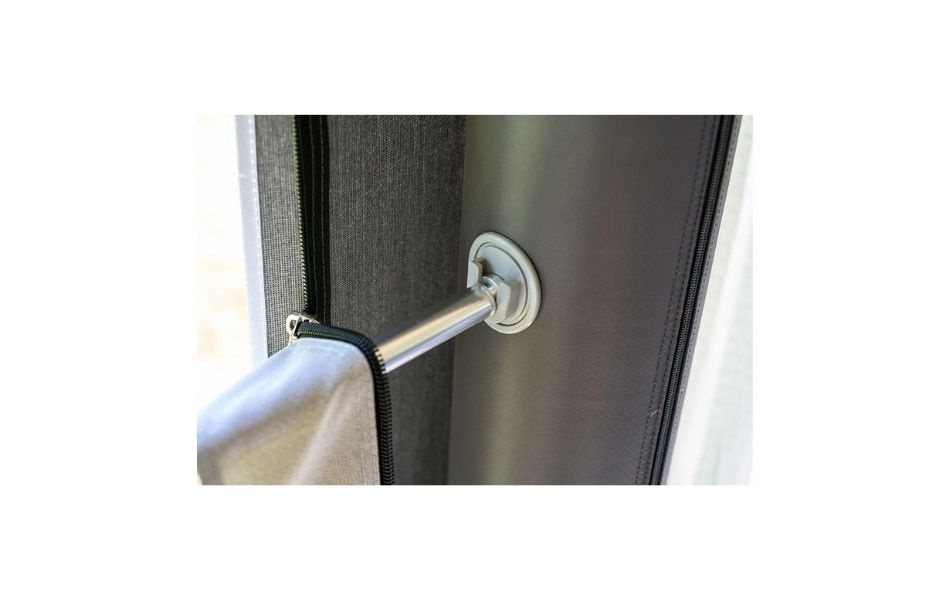 Förtältet är rymligt med ett djup på 250 cm och finns i tre bredder (260, 330 och 400 cm) med monteringshöjd 240-260 cm. Sidor och fronter kan öppnas helt för att skapa ett stort soltak eller rullas åt sidan för extra dörröppningar och ventilation. Den medföljande verandastången gör det möjligt att snabbt skapa en mysig veranda. Ventilation i fronten och myggnät på sidorna ger ett behagligt inomhusklimat utan insekter.